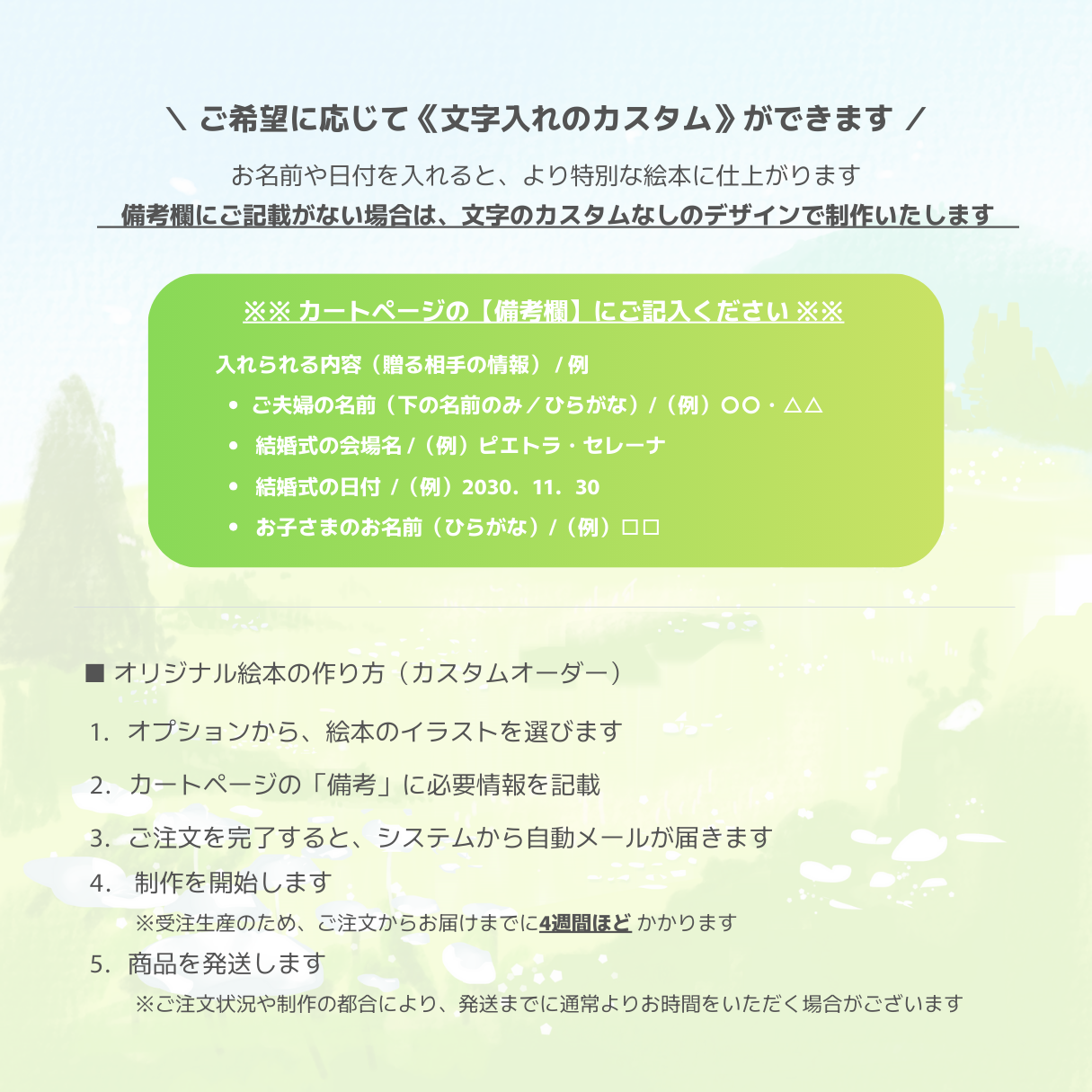 ・ご夫婦のお名前や結婚式の日付を入れた特別な絵本に。