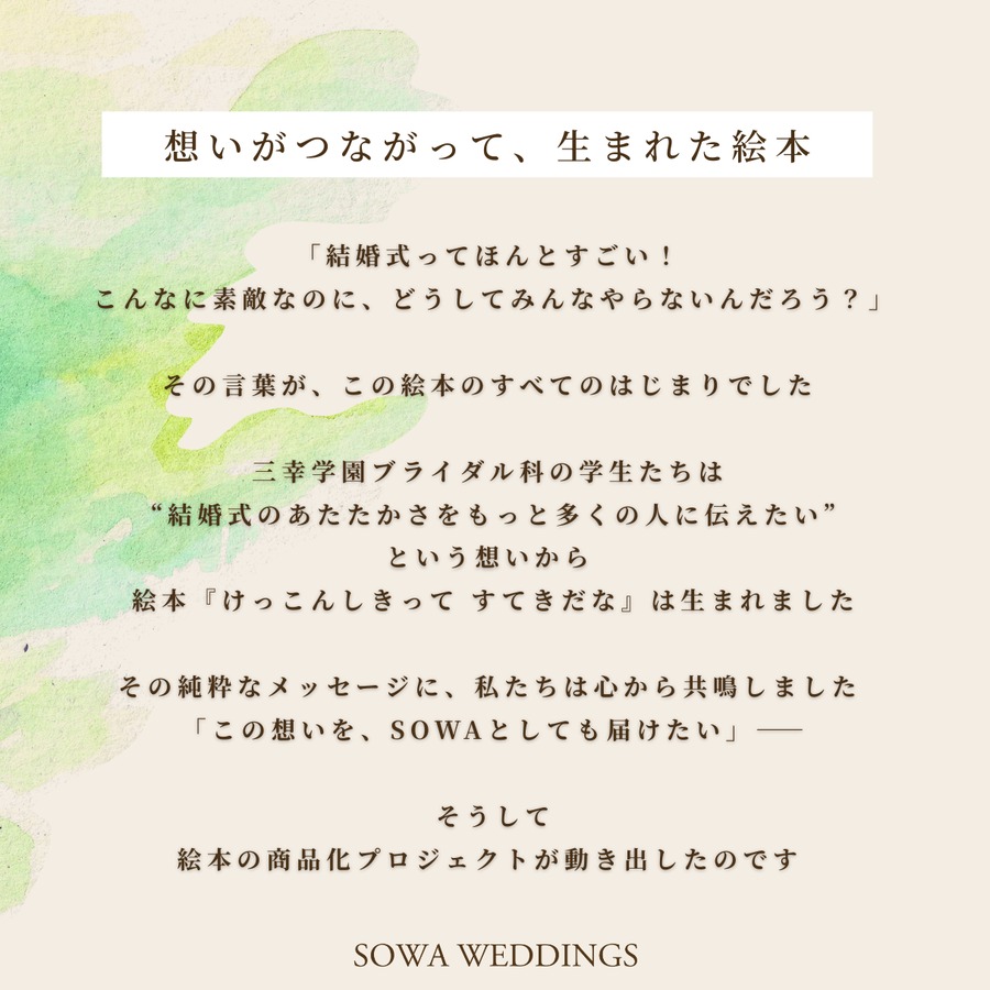 小さなお子さまへ“結婚式の幸せ”を届ける、SOWA WEDDINGSオリジナル絵本が誕生しました。読み聞かせを通じて、結婚式の楽しさや幸せを自然に感じられる一冊。ページをめくるたび、やさしいイラストと物語が広がり、小さな心がワクワクと弾みます。