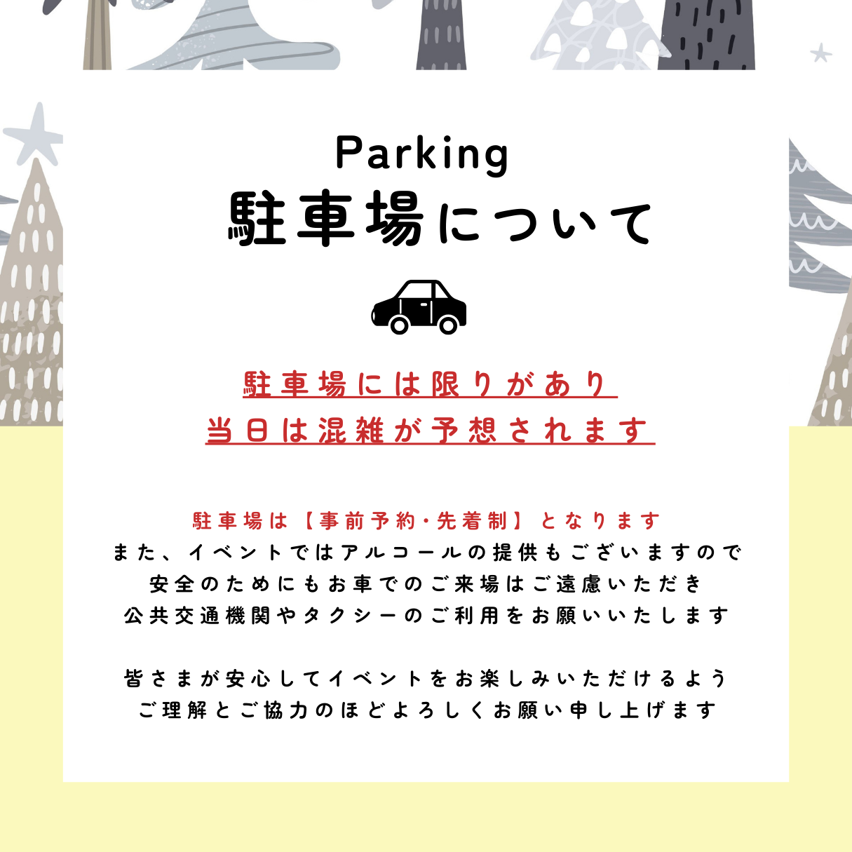 公共交通機関またはタクシーをご利用ください